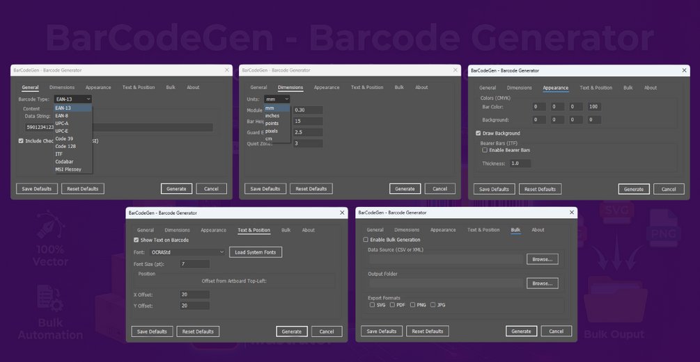 BarCodeGen - Barcode Generator eliminates the need for expensive plugins or unreliable external tools. By bringing professional, standards-compliant, vector-based barcode generation directly into Adobe Illustrator—with CMYK precision and bulk automation—it is the essential tool for any serious packaging or graphic designer.