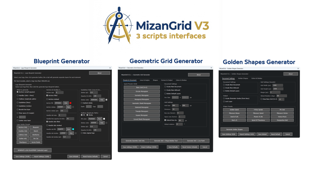 MizanGrid V3 is a big evolution of the classic grid workflow for Adobe Illustrator. While traditional grid tools help you start a design, MizanGrid V3 helps you finish, refine, and present it—using a complete 3-script toolkit: